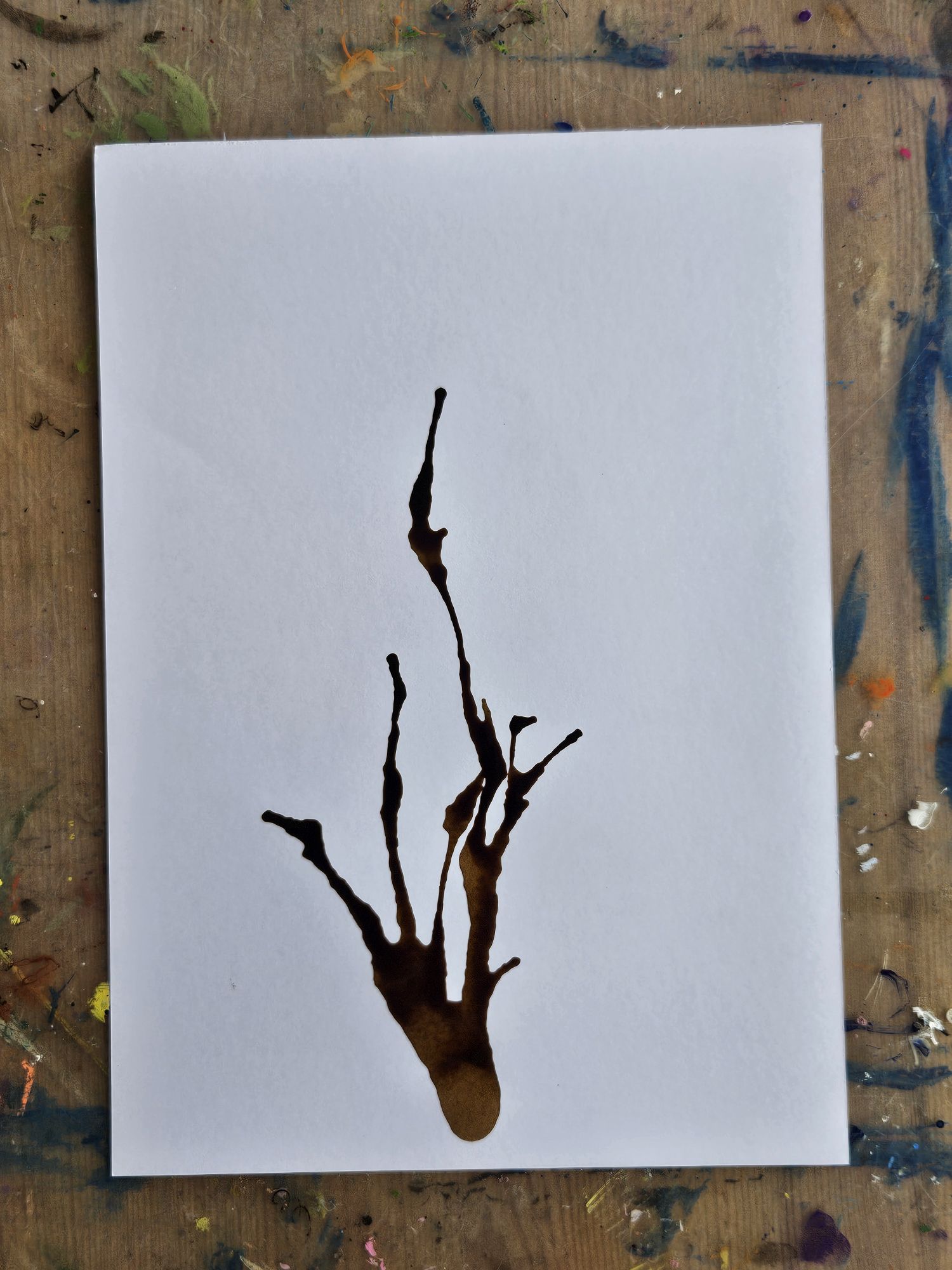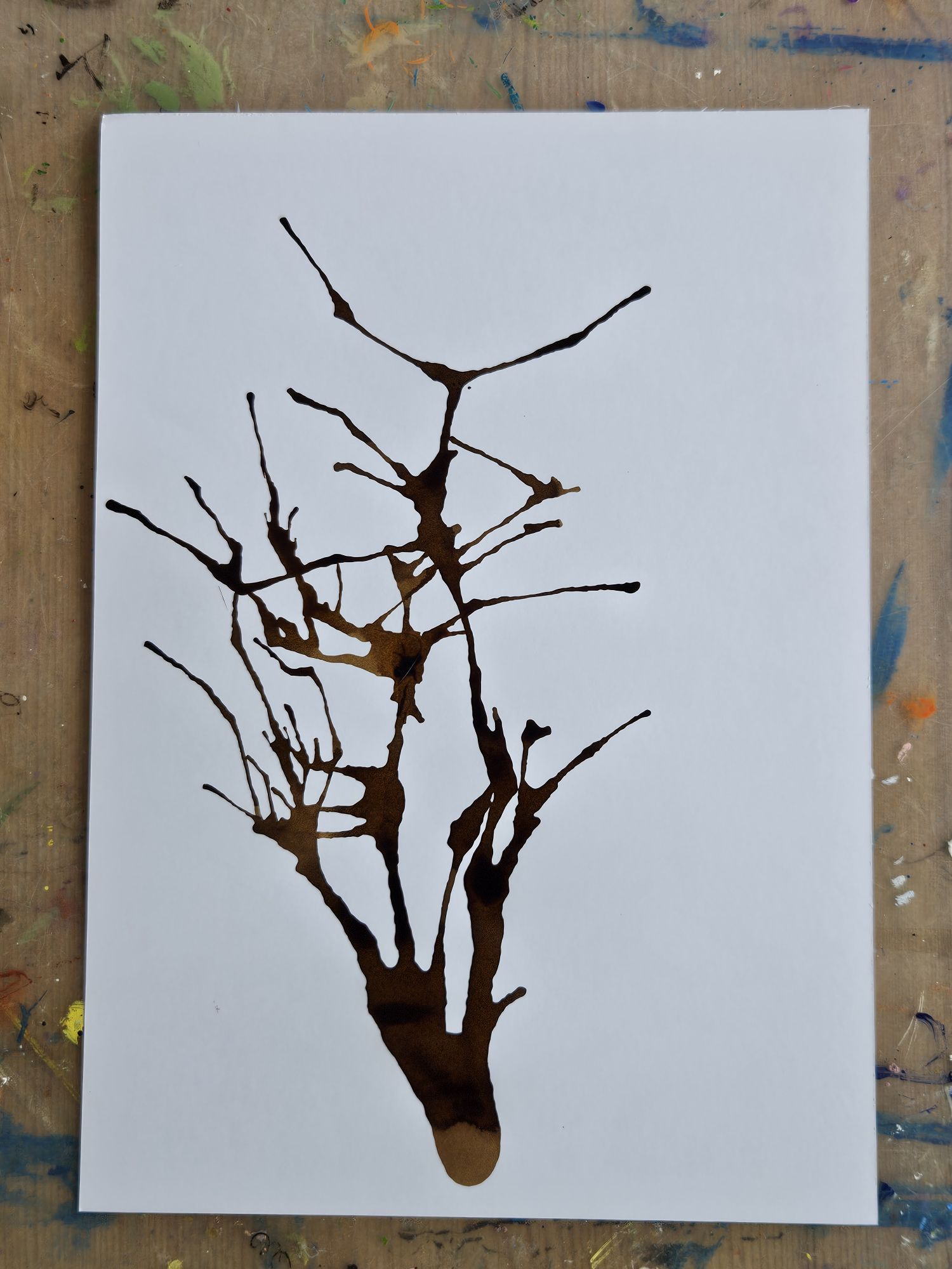 stap 2: blaas in verschillende richtingen dichtbij je papier om takken te maken aan je struik. Voeg eventueel extra druppels inkt toe.