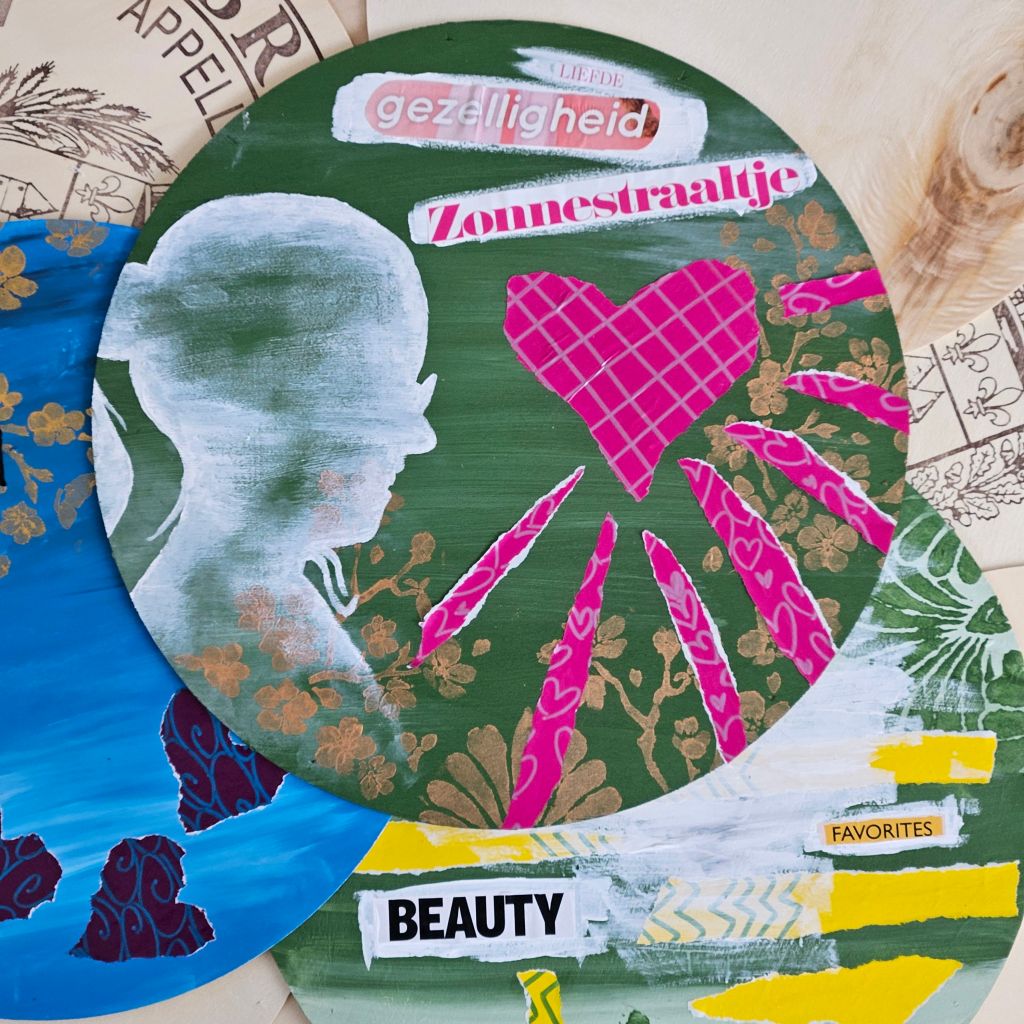 We werken met mixed media. Dat betekent dat we verschillende materialen zullen gebruiken. Ook is er tijdens deze workshop aandacht voor verschillende collage-technieken. Een tipje van de sluier: we maken o.a. gebruik van acrylverf, sjablonen, woordsnippers en gescheurd papier. Je kan werken op canvas of een sfeervolle houten kaasdoos.