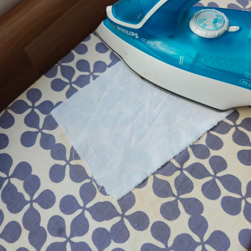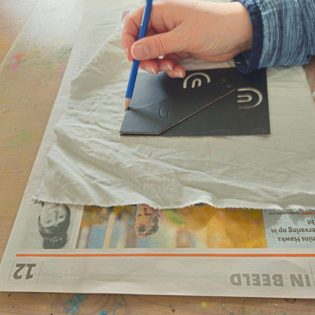 Scheur of knip het beddengoed in stroken die wat groter zijn dan het gewenste formaat, dat maakt het makkelijker om te bewerken. Trek dan je sjabloon met potlood over op de stof. Knip daarna je stof op maat, maar laat daarbij wel een rand rondom!