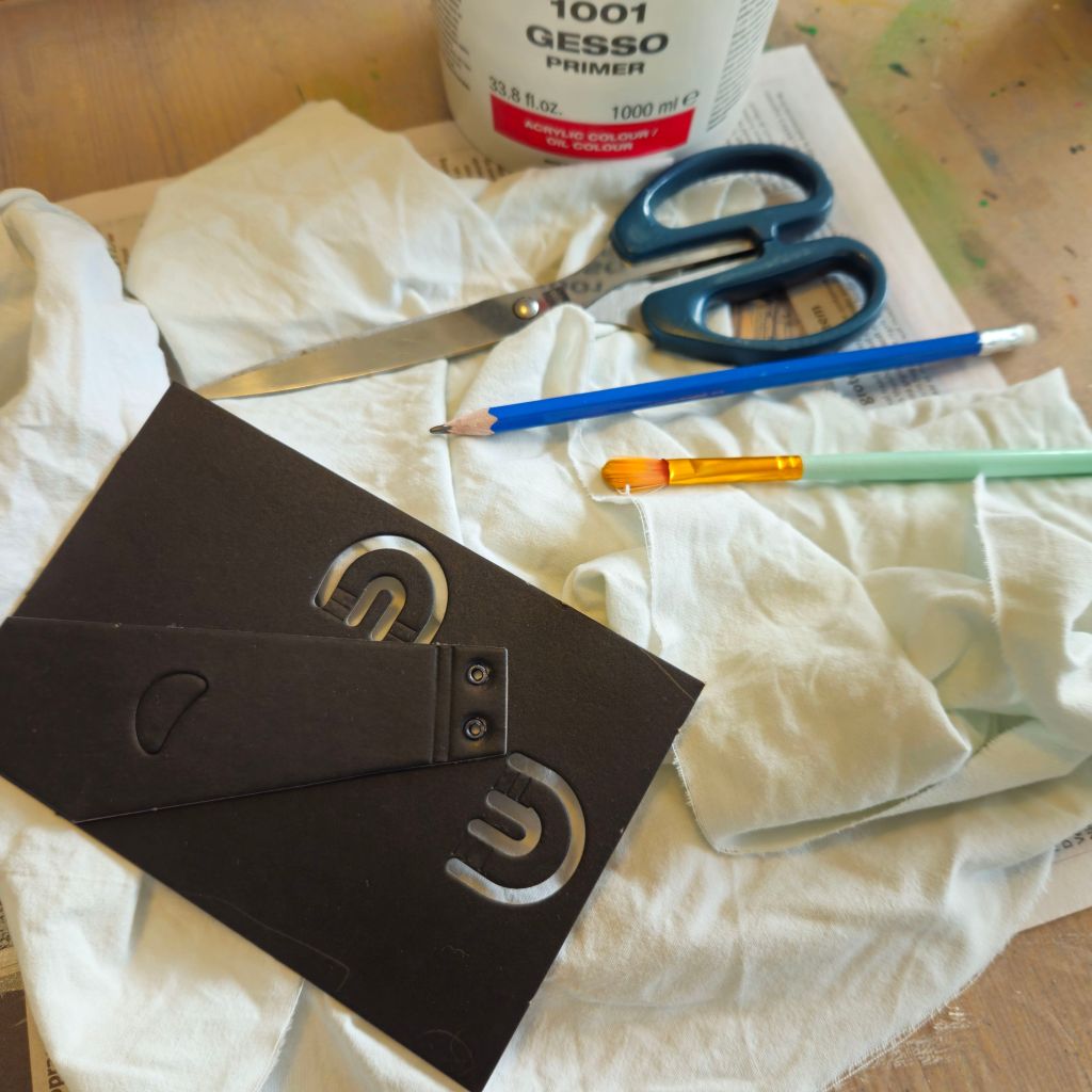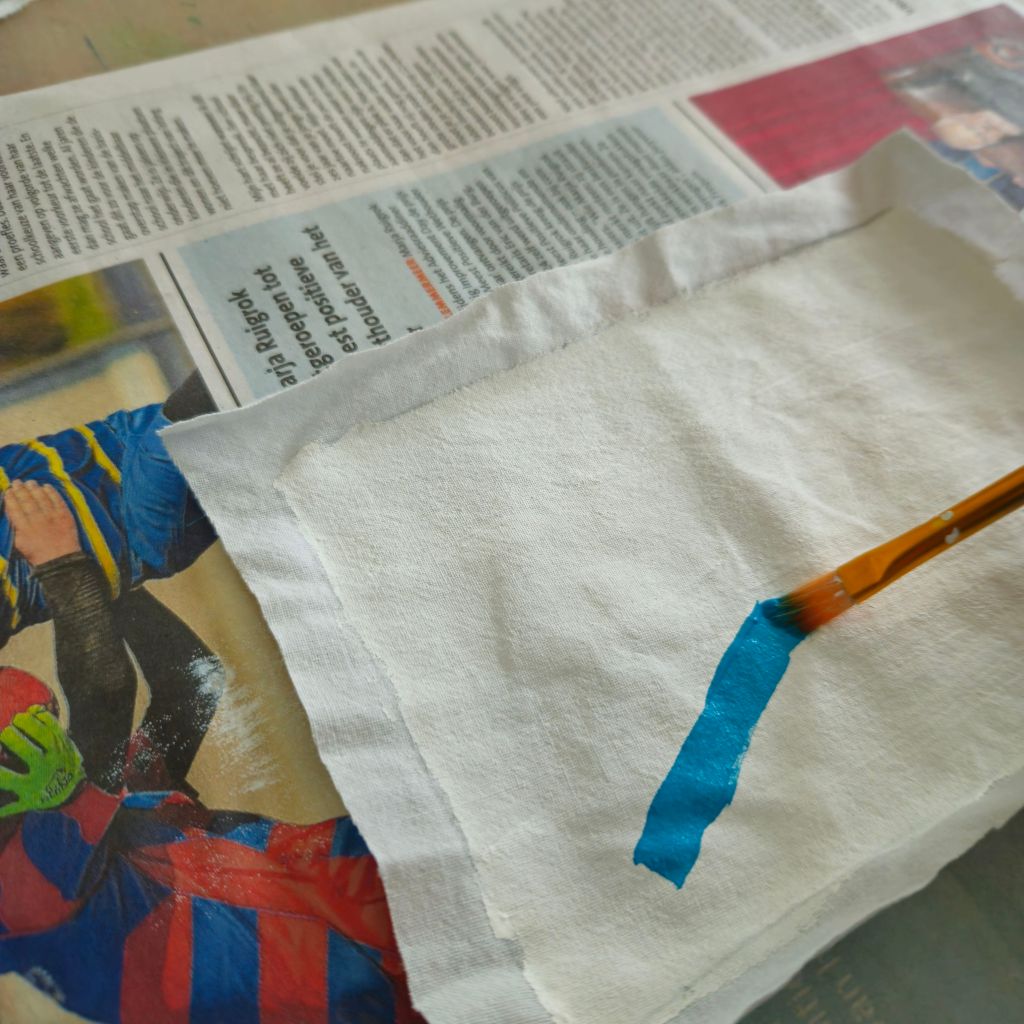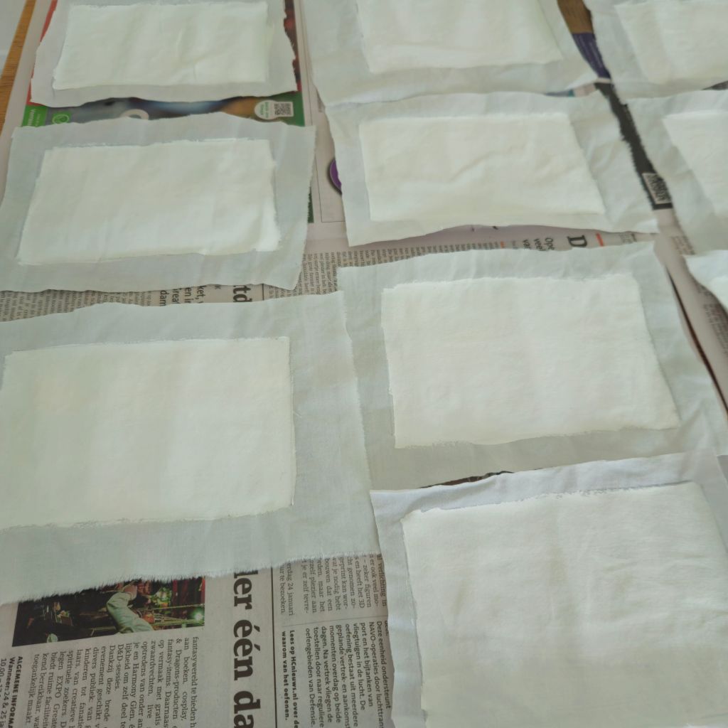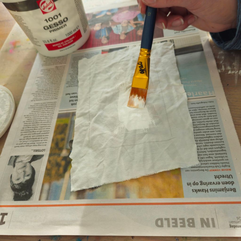 Strijk de uitgeknipte lap stof glad. Vul je rechthoek (of vierkant) met gesso.